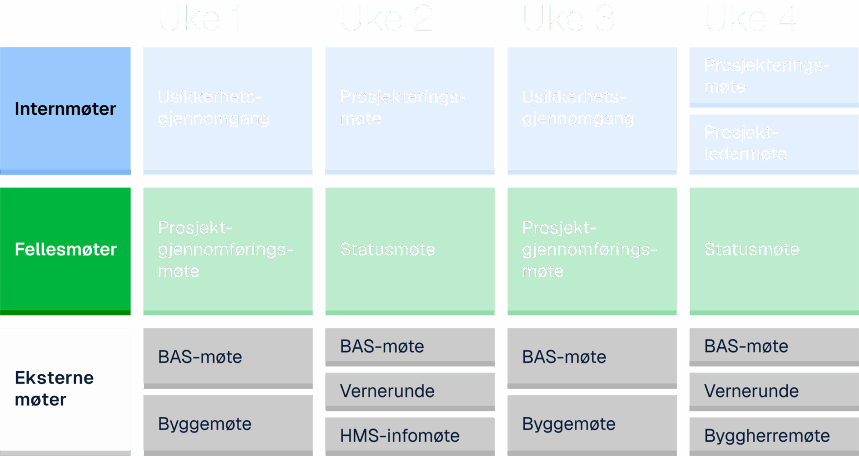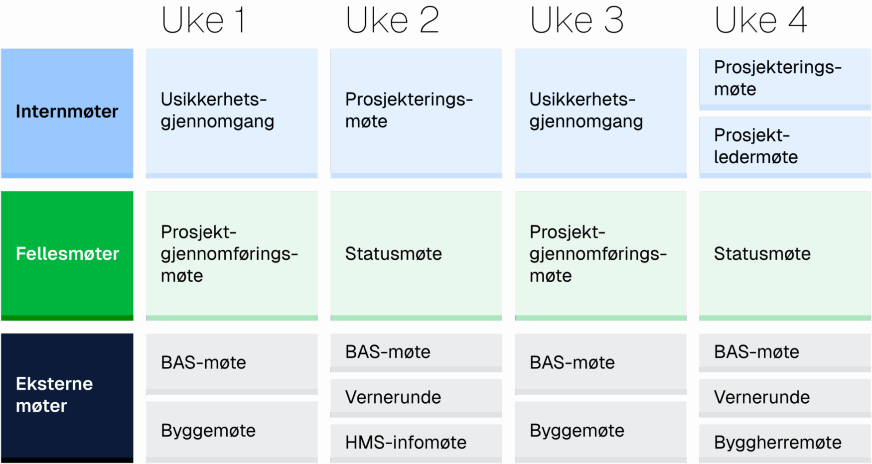 Engelsen Total har tro på standardiserte prosesser og her viser vi et typisk prosjektforløp i gjennomføringen av våre prosjekter, vist i en måneds syklus.